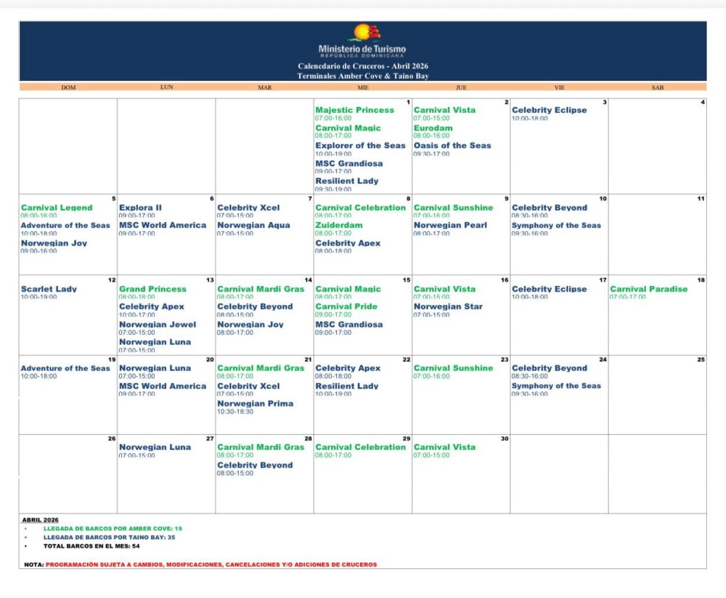 Puerto Plata, República Dominicana. – De acuerdo con la programación oficial del Ministerio de Turismo, el destino Puerto Plata recibirá 54 operaciones de cruceros durante el mes de abril de 2026, distribuidas entre las terminales Amber Cove (19) y Taíno Bay (35), evidenciando la continuidad del flujo marítimo turístico en la zona norte.